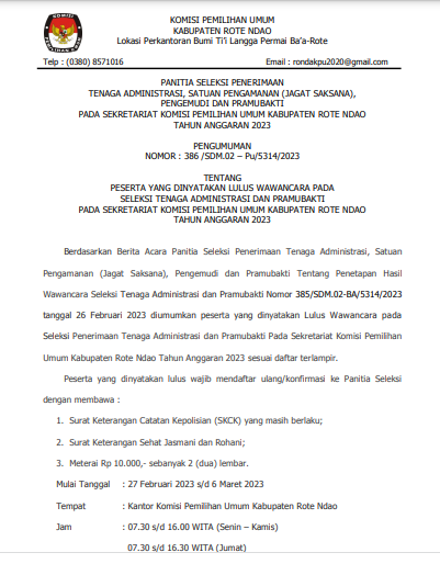 Download Hasil Seleksi Tenaga Administrasi dan Pramubakti Pada Sekretariat Komisi Pemilihan Umum Kabupaten Rote Ndao Tahun Anggaran 2023 [KLIK DISINI]