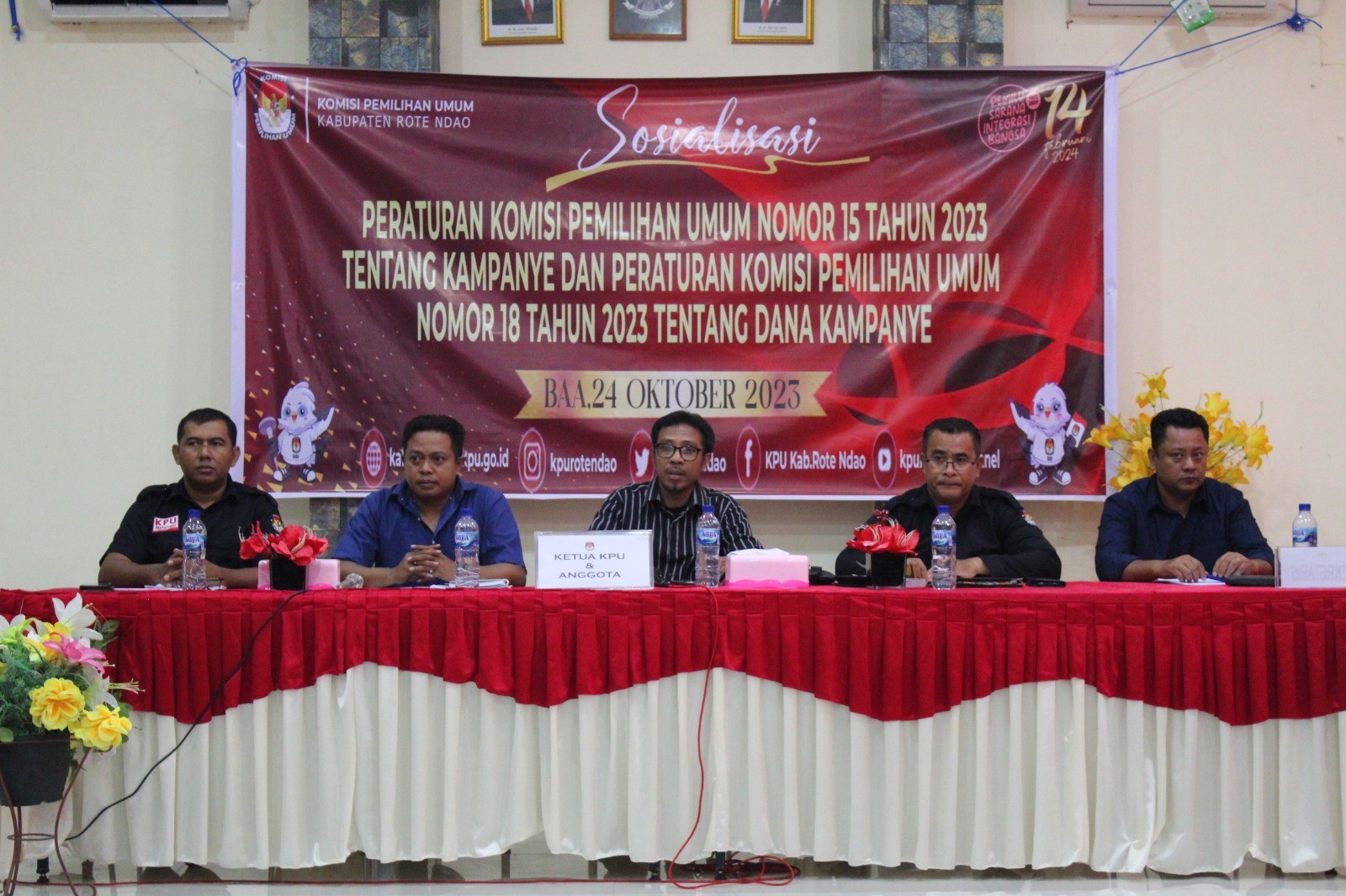 #TemanPemilih, KPU Kabupaten Rote Ndao mensosialisasikan Peraturan KPU nomor 15 Tahun 2023 Tentang Kampanye dan Peraturan KPU Nomor 18 Tahun 2023 tentang Dana Kampanye di Aula New Hotel Ricky Ba’a, Kelurahan Namodale, Kecamatan Lobalain, Pukul 10.00 WITA sampai selesai pada Selasa(24/10/23)