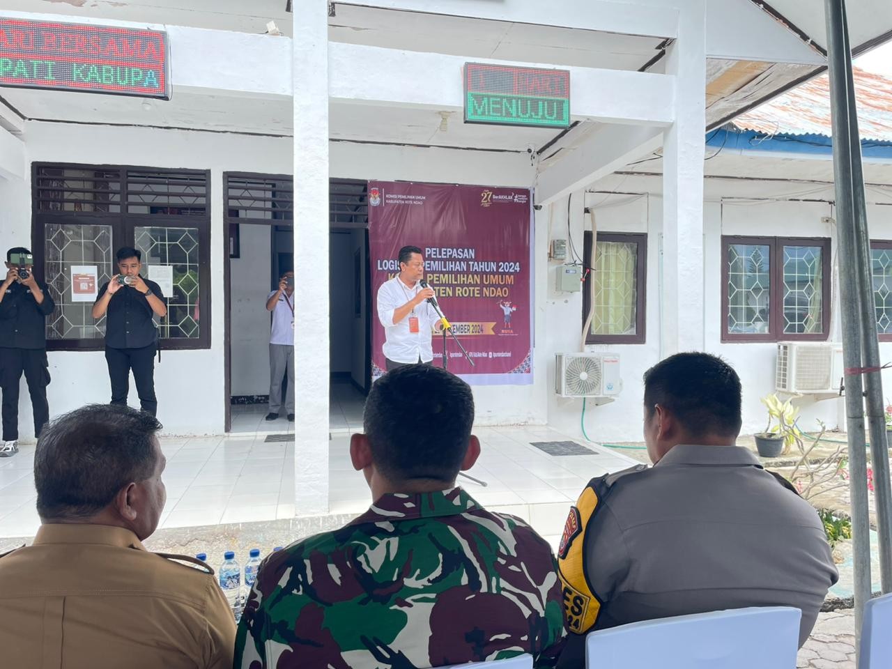 Acara Pelepasan dimulai pukul 13.00 Wita dipimpin oleh Ketua KPU Kabupaten Rote Ndao bersama Anggota KPU Kabupaten Rote Ndao di halaman kantor KPU Kabupaten Rote Ndao, Senin(25/11/2024). Dalam sambutannya Ketua KPU Kabupaten Rote Ndao menjelaskan bahwa dalam distribusi logistik sudah dilakukan sejak tanggal 24 November 2024 pukul 12.00 wita untuk kecamatan Ndao Nuse, distribusi logistik tersebut di dahulukan karena mengingat cuaca dan pasang surutnya air laut dan harus menggunakan perahu dalam melakukan penyebrangan distribusi logistik serta di kawal langsung oleh anggota Kepolisian Resort Rote Ndao sampai ke kecamatan Ndao Nuse, dan hari ini akan didistribusikan untuk 10 kecamatan yakni kecamatan Rote Barat, Kecamatan Rote Barat Daya, Kecamatan Loaholu, Kecamatan Rote Barat Laut, Kecamatan Lobalain, Kecamatan Rote Selatan, Kecamatan Rote Tengah, Kecamatan Pantai Baru, Kecamatan Rote Timur dan Kecamatan Landu Leko.