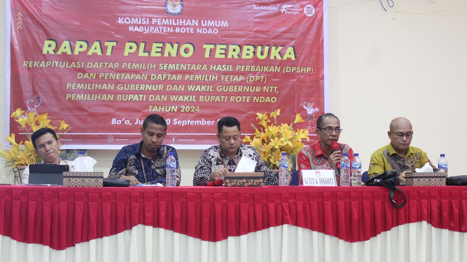 #TemanPemilih, KPU Kabupaten Rote Ndao gelar kegiatan Rapat Pleno terbuka rekapitulasi Daftar Pemilih Sementara Hasil Perbaikan (DPSHP) dan Penetapan Daftar Pemilih Tetap (DPT) Pemilihan Gubernur dan Wakil Gubernur NTT serta Bupati dan Wakil Bupati Rote Ndao Tahun 2024, bertempat di Aula New Hotel Ricky Ba’a, Kelurahan Namodale, Kecamatan Lobalain, Pukul 10.00 Wita sampai selesai pada Jumat(20/9/2024).