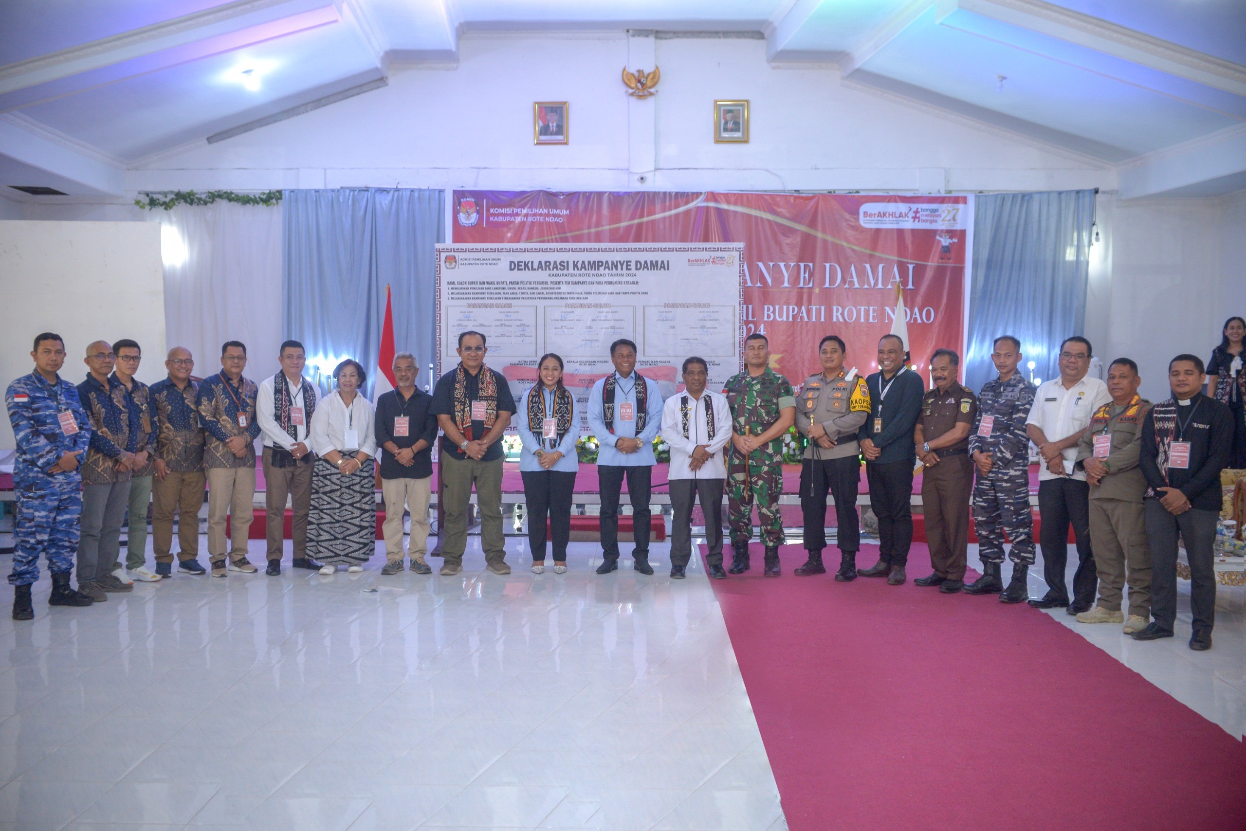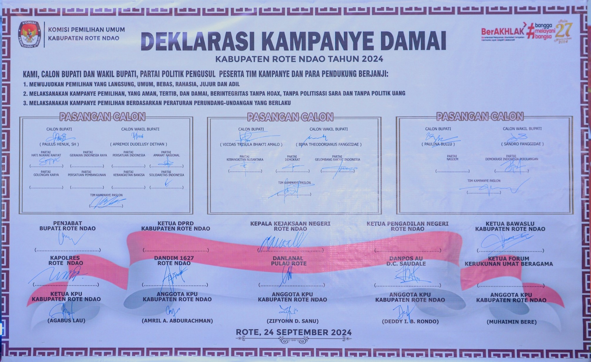 Kegiatan diakhiri dengan penandatanganan deklarasi kampanye damai oleh ketiga pasangan calon bupati dan wakil bupati Rote Ndao, Partai Politik Pengusul, Ketua Tim Kampanye, Forkopimda, Bawaslu ,KPU Kabupaten Rote Ndao kemudian dilanjutkan dengan penyerahan Surat Keputusan Komisi Pemilihan Umum Kabupaten Rote Ndao Nomor 755 Tahun 2024 Tentang Pembatasan Pengeluaran Dana Kampanye dalam Pemilihan Bupati dan Wakil Bupati Rote Ndao Tahun 2024, Surat Keputusan Komisi Pemilihan Umum Kabupaten Rote Ndao Nomor 756 Tahun 2024 Tentang Penetapan Zona dan Jadwal Kampanye Calon Bupati dan Wakil Bupati Rote Ndao Pemilihan Serentak Tahun 2024 serta Surat Keputusan Komisi Pemilihan Umum Kabupaten Rote Ndao Nomor 757 Tahun 2024 Penetapan Lokasi Pemasangan Alat Peraga Kampanye Dalam Pemilihan Gubernur dan Wakil Gubernur Provinsi Nusa Tenggara Timur, Bupati dan Wakil Bupati Rote Ndao Tahun 2024.