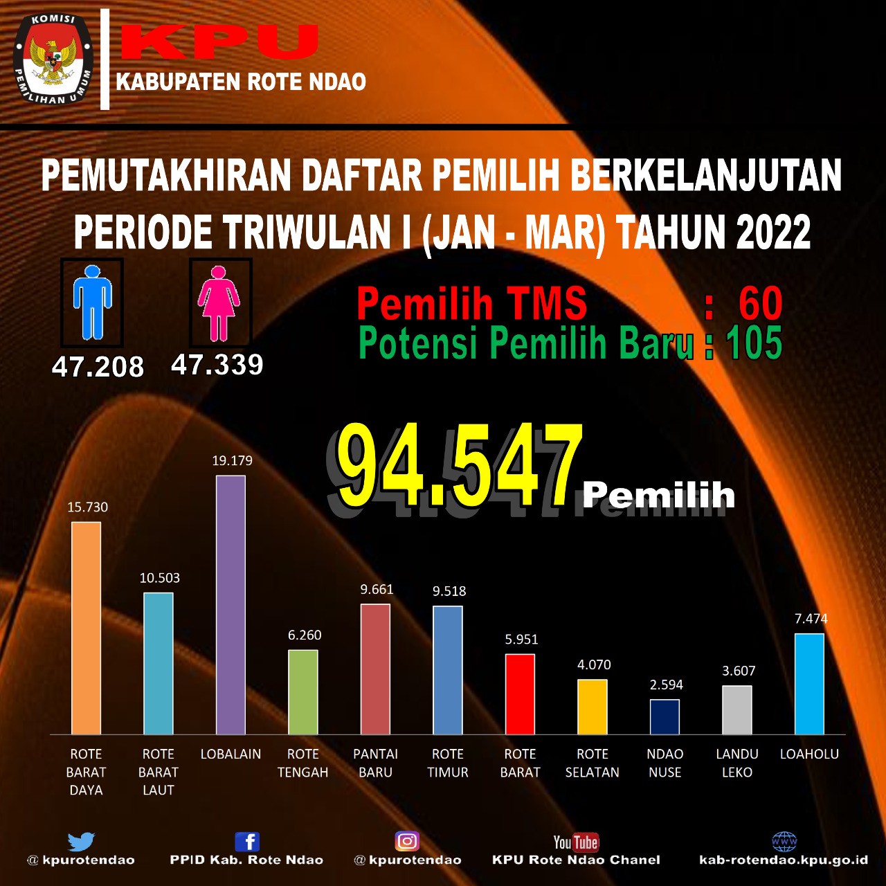 Hofra A. Anakay Anggota KPU Kabupaten Rote Ndao Divisi Perencanaan Data dan Informasi yang menangani Pemutahiran Data Pemilih Berkelanjutan, pada kegiatan ini menyampaikan hasil PDPB Triwulan I (Bulan Januari – Maret) Tahun 2022 berjumlah 94.547 (sembilan puluh empat ribu lima ratus empat puluh tujuh) Pemilih dengan rincian Laki-laki sebanyak 47.208 (empat puluh tujuh dua ratus delapan) Pemilih dan Perempuan sebanyak 47.339 (empat puluh tujuh ribu tiga ratus tiga puluh sembilan) Pemilih. Jumlah Pemilih Baru Kategori Pemilih Pemula sebanyak 105 (seratus lima) Pemilih Pemula dan Jumlah Pemilih Tidak Memenuhi Syarat (TMS) Kategori Meninggal sebanyak 60 (enam puluh) orang. Hasil dari Rapat Koordinasi ini dituangkan dalam Berita Acara Nomor 14 Tahun 2022 dan di serahkan ke semua pihak yang hadir.