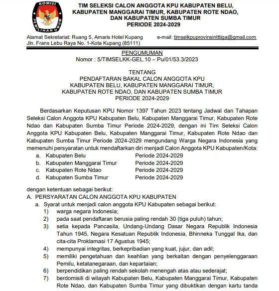 PENDAFTARAN BAKAL CALON ANGGOTA KPU KABUPATEN BELU, KABUPATEN MANGGARAI TIMUR, KABUPATEN ROTE NDAO, DAN KABUPATEN SUMBA TIMUR PERIODE 2024-2029