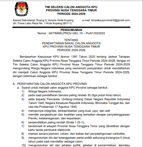Download Persyaratan Pendaftaran Bakal Calon Anggota KPU Provinsi Nusa Tenggara Timur Periode 2024-2029 [KLIK DISINI]