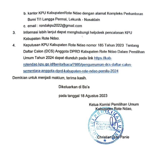 Surat Keputusan KPU Kabupaten Rote Ndao Nomor 185 Tahun 2023 tentang Daftar Calon Sementara Anggota DPRD Kabupaten Rote Ndao Dalam Pemilihan Umum Tahun 2024 :