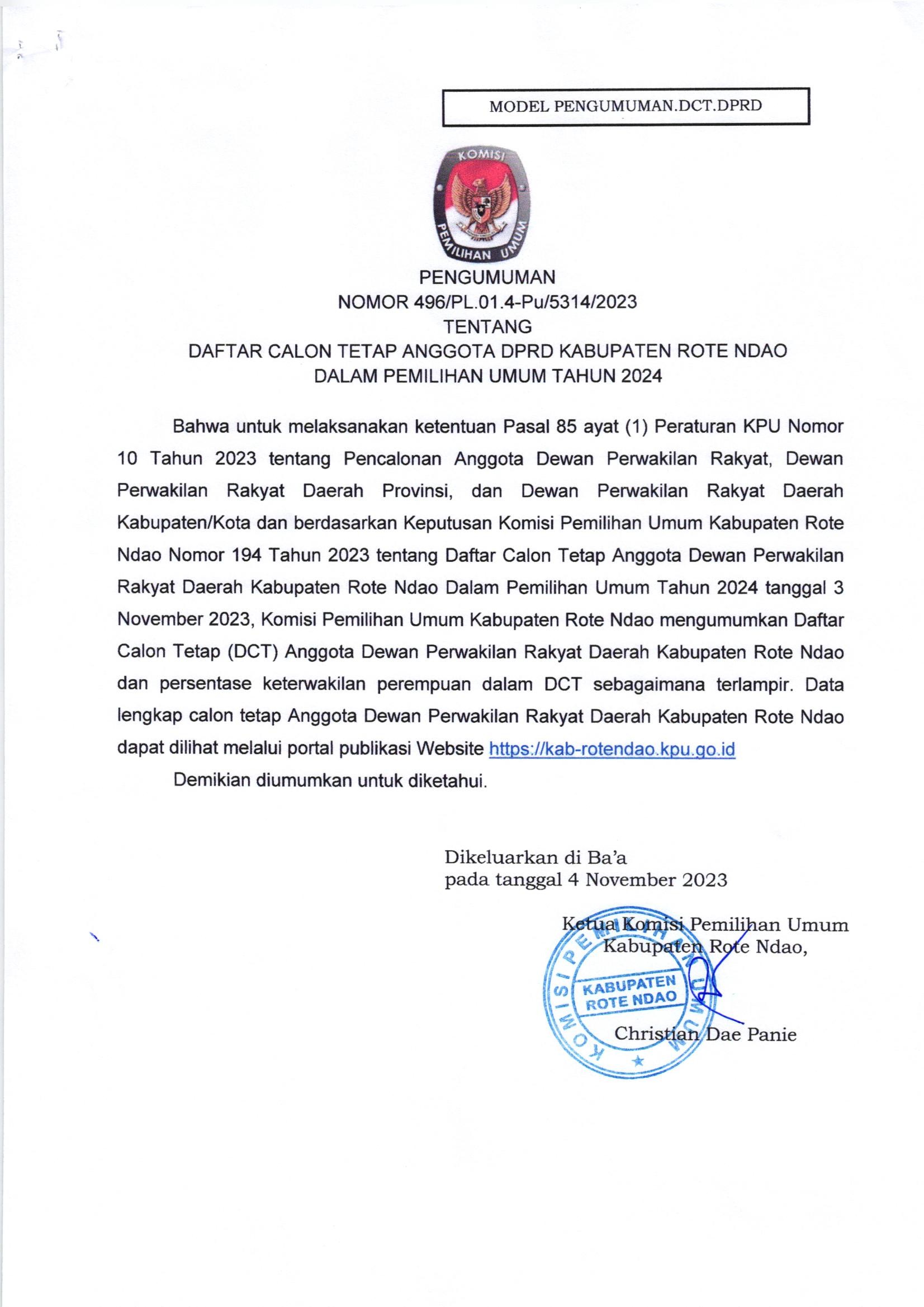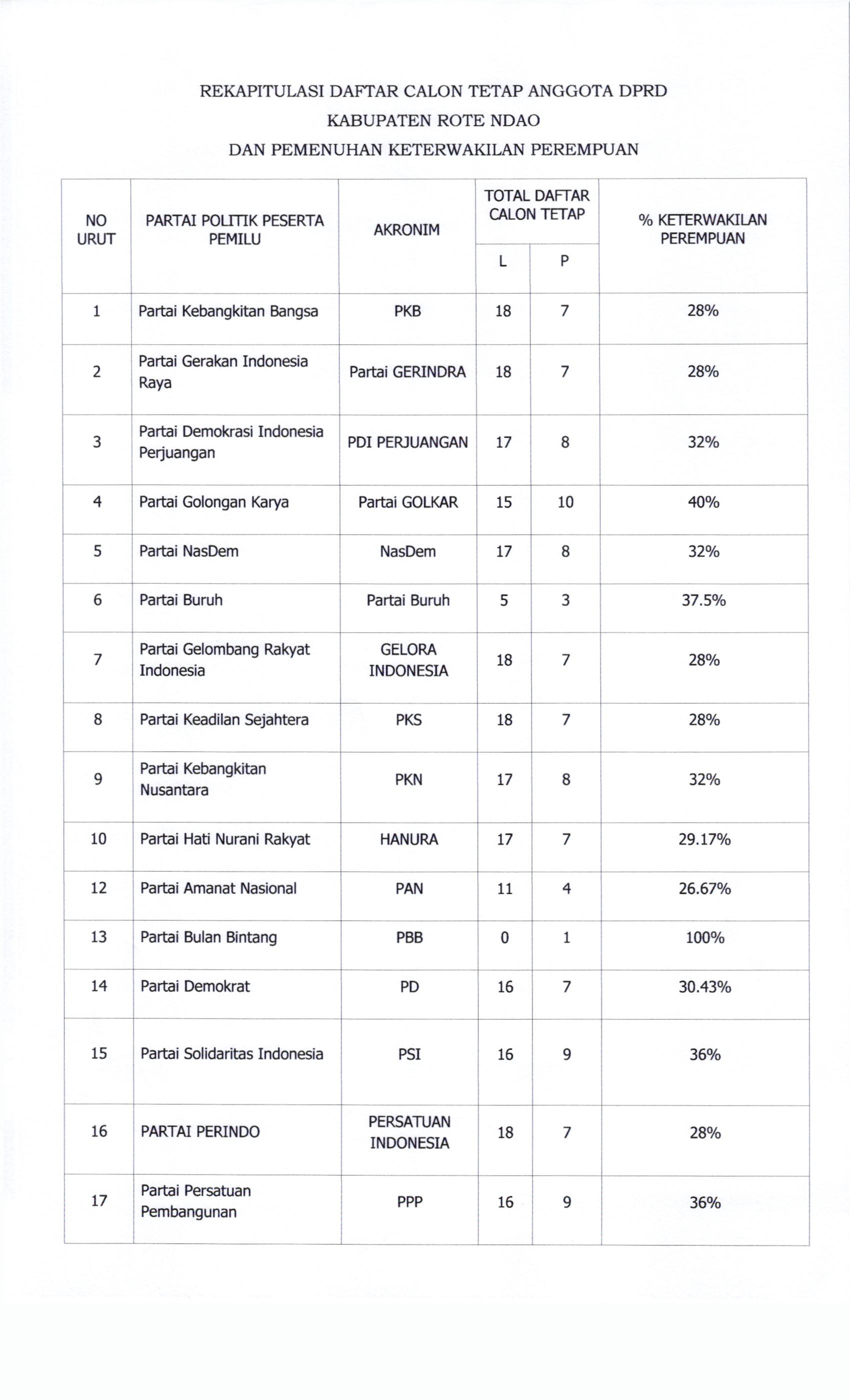 Pengumuman DCT (Daftar Calon Tetap) Anggota DPRD Kabupaten Rote Ndao Pemilu 2024