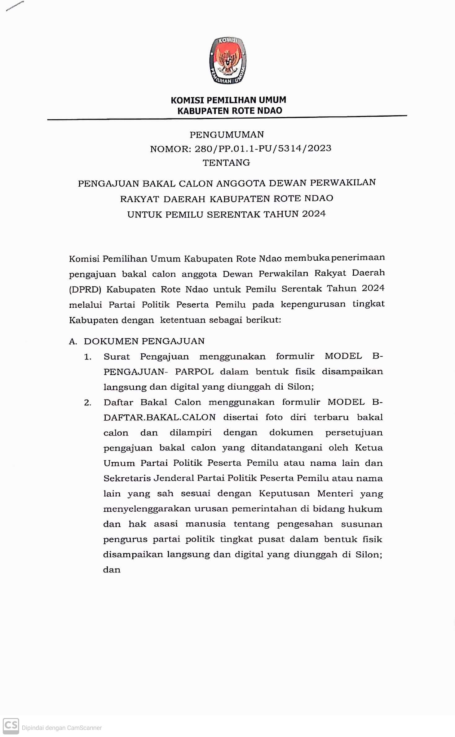 Pengumuman Nomor:280/PP.01.1-PU/5314/2023 Tentang Pengajuan Bakal Calon Anggota Dewan Perwakilan Rakyat Daerah Kabupaten Rote Ndao Untuk Pemilu Serentak Tahun 2024
