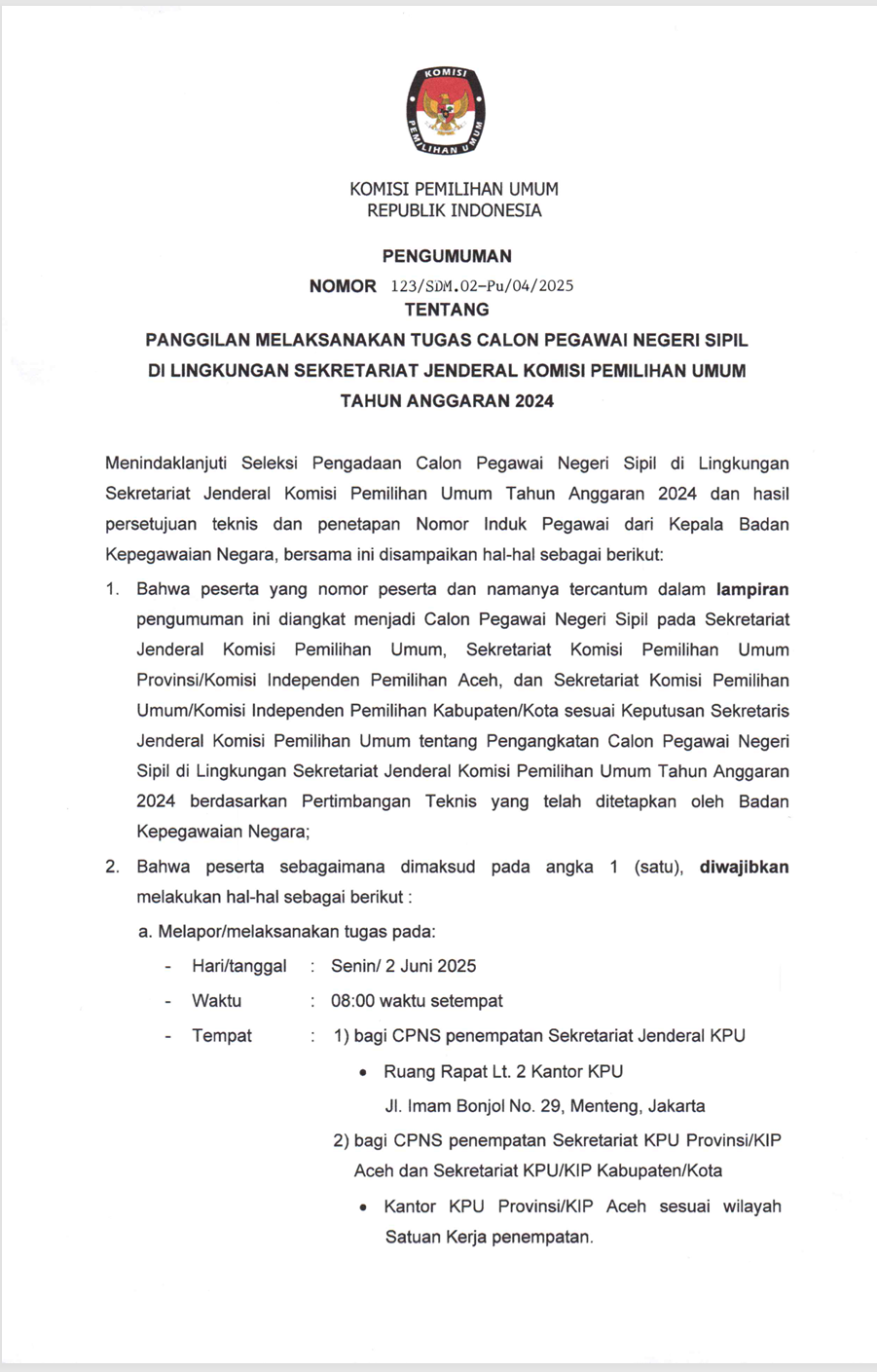 Pengumuman Panggilan Melaksanakan Tugas Calon Pegawai Negeri Sipil di Lingkungan Sekretariat Jendral Komisi Pemilihan Umum Tahun Anggaran 2024