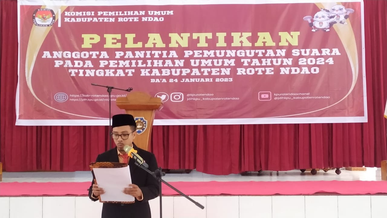 Ketua Komisi Pemilihan Umum (KPU) Kabupaten Rote Ndao Christian Dae Panie mengambil sumpah dan melantik 357 (tiga ratus lima puluh tujuh) anggota Panitia Pemungutan Suara (PPS) Pemilu Serantak Tahun 2024 se-Kabupaten Rote Ndao.