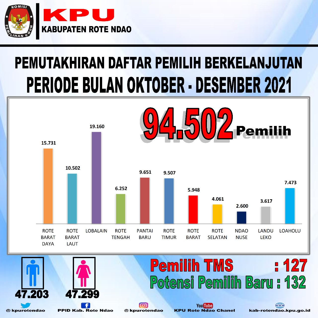 Sebelum menutup kegiatan, Ketua KPU Kabupaten Rote Ndao membacakan Berita Acara Penetapan Daftar Pemilih Berkelanjutan dengan hasil Rekapitulasi Daftar Pemilih Berkelanjutan sebanyak 94.502 (Sembilan puluh' empat ribu lima ratus dua) pemilih, dengan rincian laki-laki berjumlah 47.203 (empat 'puluh tujuh ribu dua ratus tiga) pemilih dan pemilih perempuan 'berjumlah 47.299 (empat puluh tujuh ribu dua ratus Sembilan puluh Sembilan) pemilih, tersebar di 11 ( sebelas ) Kecamatan di Kabupaten Rote Ndao.