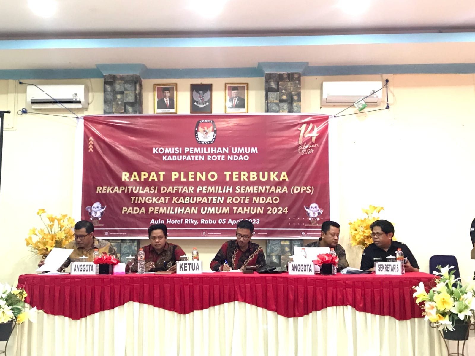 #Temanpemilih KPU Kabupaten Rote Ndao Gelar Rapat Pleno Rekapitulasi Daftar Pemilih Sementara (DPS) tingkat Kabupaten Rote Ndao di Gedung New Hotel Ricky Ba’a, Kelurahan Namodale, Kecamatan Lobalain, Pukul 10.00 WITA sampai selesai pada Rabu (05/4/2023) Secara resmi, Kegiatan dibuka oleh ketua KPU Rote Ndao, Christian Dae Panie yang dalam sambutannya, menjelaskan bahwa data pemilih yang diplenokan masih banyak kekurangan sehingga perlu disempurnakan. “Siapapun yang memiliki kepentingan dan kepedulian, mohon bersama kita koreksi dan benahi data ini agar semua yang memiliki hak pilih dapat menggunakan hak pilihnya,” ujar Christian Dae Panie, Ketua KPU Rote Ndao. Hasil Rekapitulasi Perubahan Pemilih Untuk DPS Pemilihan Umum Tahun 2024 Tingkat Kabupaten Rote Ndao di 119 Kelurahan/Desa dan 447 TPS, dengan jumlah Pemilih Aktif sebanyak 102.283 orang dan Jumlah Pemilih Baru sebanyak 13.637 orang. Dari data tersebut diketahui bahwa Jumlah Pemilih Tidak Memenuhi Syarat sebanyak 17.547 orang, dan Perbaikan Data Pemilih sebanyak 18.833 orang dengan data Pemilih Potensial Non KTP-el sebanyak 2.676 orang. Hadir dalam Kegiatan tersebut Ketua dan Anggota KPU Kabupaten Rote Ndao, Sekretaris Kabupaten Rote Ndao bersama jajaran Sekretariat, Bawaslu Kabupaten Rote Ndao,Polres Rote Ndao, Dandim 1627 Rote Ndao, Pimpinan Lapas Kabupaten Rote Ndao, Pimpinan Dukcapil Kabupaten Rote Ndao, pimpinan kesbangpol Kabupaten Rote Ndao, Pimpinan Partai Politik calon peserta pemilu 2024 tingkat Kabupaten Rote Ndao, Ketua dan Anggota PPK divisi program dan data se-Kabupaten Rote Ndao, dan Insan Pers.